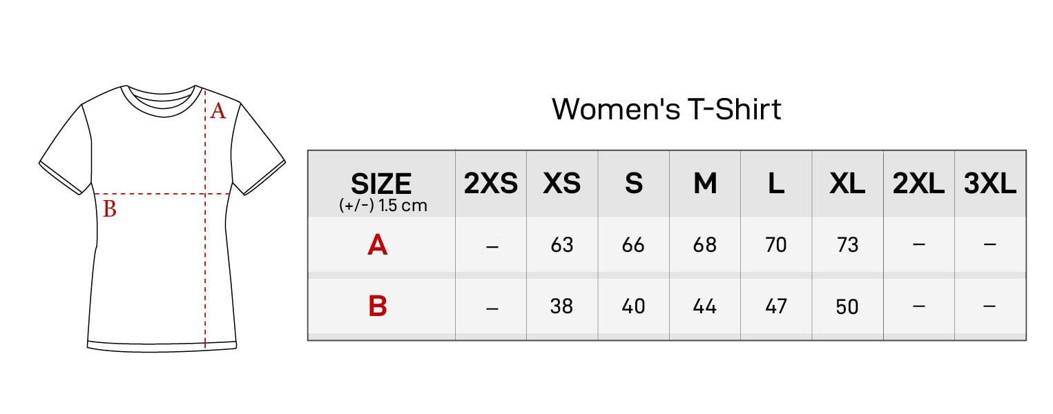The Lady's T-shirt is slim-fitted which means sizes run small. The sides are slightly contoured and the sleeves are shorter than the men's cut.
